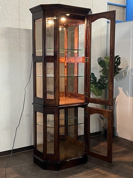 本日ご紹介するのは、深い色合いと優雅なシルエットが目を引く『アンティーク調キュリオケース』でございます。お気に入りのコレクションを輝かせるための照明を備えたこの一台は、お部屋の雰囲気を格上げする主役級の存在感を持っております。大切なお品物を飾るための場所として、長年愛用されてきた特別な家具とお見受けいたします。