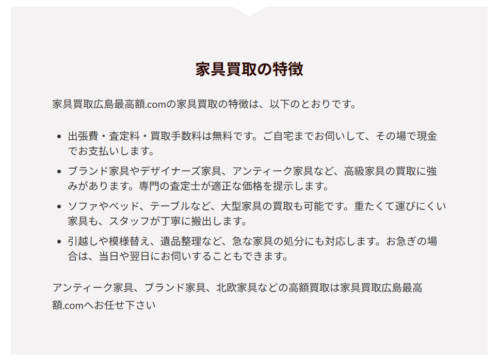 広島市内で家具買取なら、定番の家具から大型家具、貴重な骨董系家具や高級なブランド家具・デザイナーズ家具他、国産家具や北欧家具など、とにかく家具買取ならどれもお任せください!安心の出張買取はもちろん、持ち込みも大歓迎♪家具を売るなら、家具買取ならぜひ当社へお任せくださいませ。買取のご相談やご質問、ご依頼や出張買取の予約など下記お問合せよりお気軽にご連絡下さいませ。